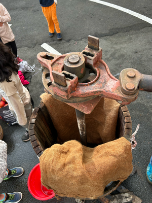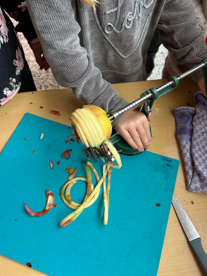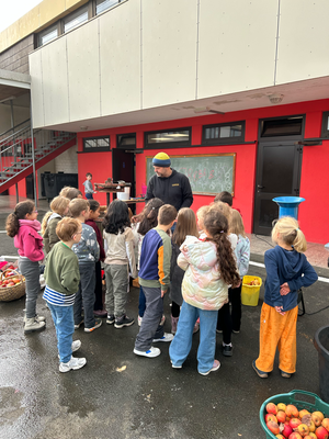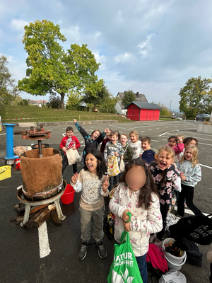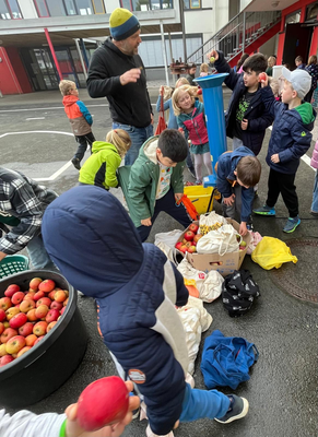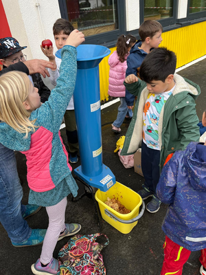 Auf einer nahegelegenen Wiese sammelten die Schülerinnen und Schüler anschließend Äpfel, die sie gemeinsam zu frischem Apfelsaft kelterten. Auch die Eltern unterstützen tatkräftig beim Sammeln mit heimischen Äpfeln aus dem Garten. Dabei konnten die Schülerinnen und Schüler den Weg „vom Apfel am Baum bis zum Saft im Glas“ hautnah miterleben.