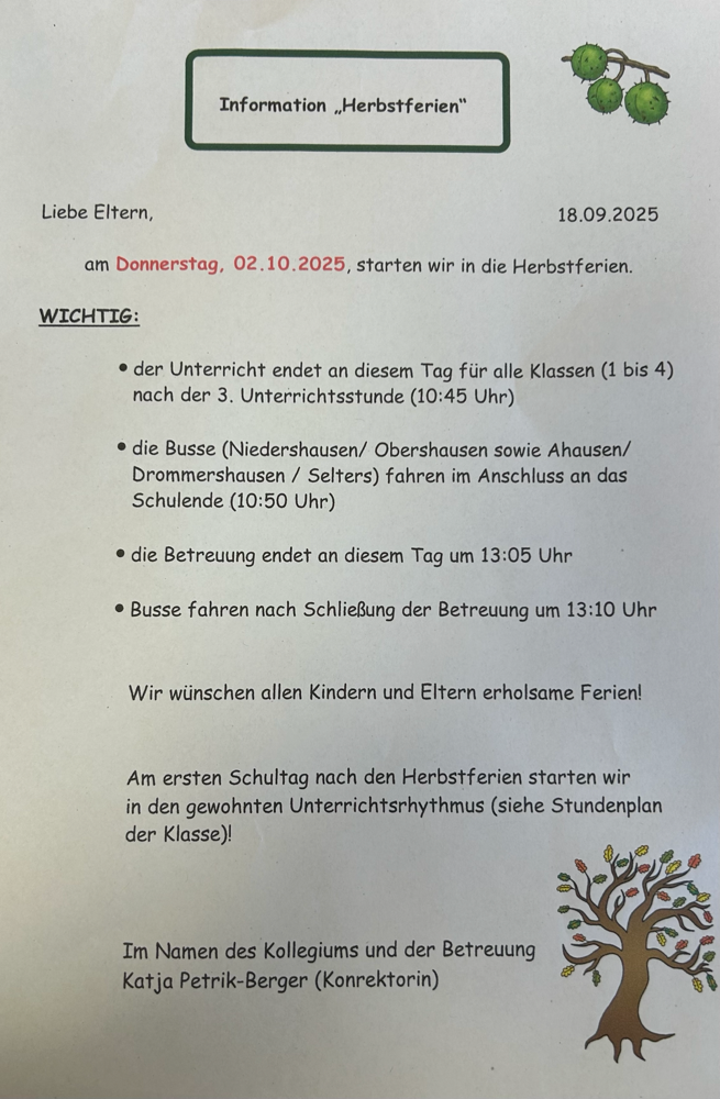 Beginn Herbstferien / Unterricht endet für alle um 10:45 Uhr